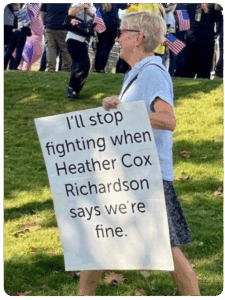 It took a little while but as I made my way through the crowd I felt the need to march, even if it was just me. (In reality many others were doing the same). Soon a smile came over my face as I realized that this same energy was playing out in hundreds of cities across America. For the next hour or so, I felt joyous. I became impressed by many of the messages I was able to read during my journey along Main Street. My favorite however was sent via text to my wife Deborah, from her childhood buddy Reagan Long. She and her husband Joey attended a NO KINGS rally in Chico, California. Here it is along with another she sent touting the powers of Heather Cox Richardson, a noted historian.